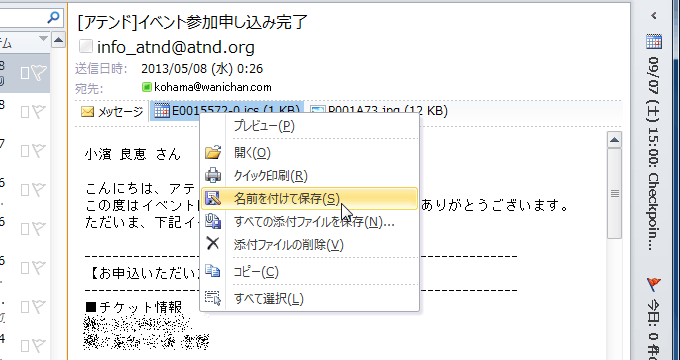 - 保存したい添付ファイルを右クリックして、ショートカットメニューより[名前を付けて保存]をクリックします。