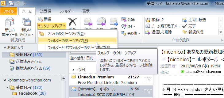- 対象となるフォルダーを選択し、[ホーム]タブの[クリーンアップ]をクリックします。