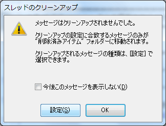 重複するメッセージがない場合、「メッセージはクリーンアップされませんでした」というメッセージが表示されます。クリーンアップの対象外とするメッセージや、メッセージが削除される際の移動先を指定するには、[設定]ボタンをクリックして[Outlookのオプション]ダイアログボックスの[メール]タブの[クリーンアップ]グループにて設定します。