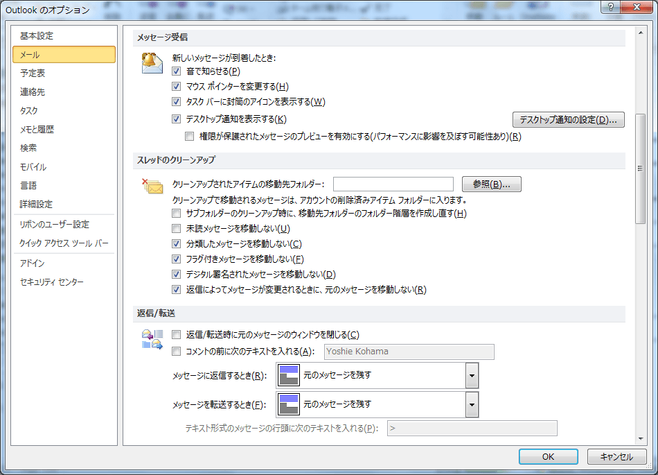 [返信によってメッセージが変更されるときに、元のメッセージを移動しない]チェック ボックスをオンまたはオフにします。このオプションは、オンにすることをお勧めします。これにより、返信に含まれているメッセージが変更された場合でも、スレッド内のすべてのコンテンツを完全に記録しておくことができます。