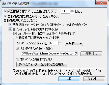 - [古いアイテムの整理]ダイアログボックスの[次の間隔で古いアイテムの整理を行う]にチェックを入れて、[OK]ボタンをクリックします。