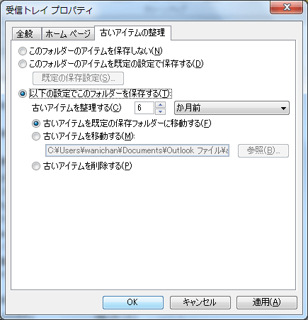- 選択したフォルダーのプロパティが表示され、[古いアイテムの整理]タブが開くので、[以下の設定でこのフォルダーを保存する]を選択し、[古いアイテムを既定の保存フォルダーに移動する]を選択して[OK]ボタンをクリックします。