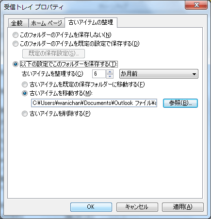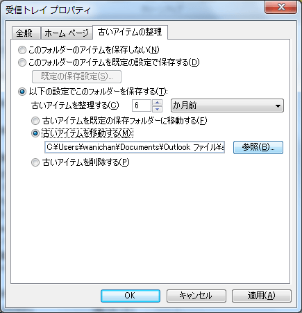 - [古いアイテムを移動する]を選択して[参照]ボタンをクリックします。