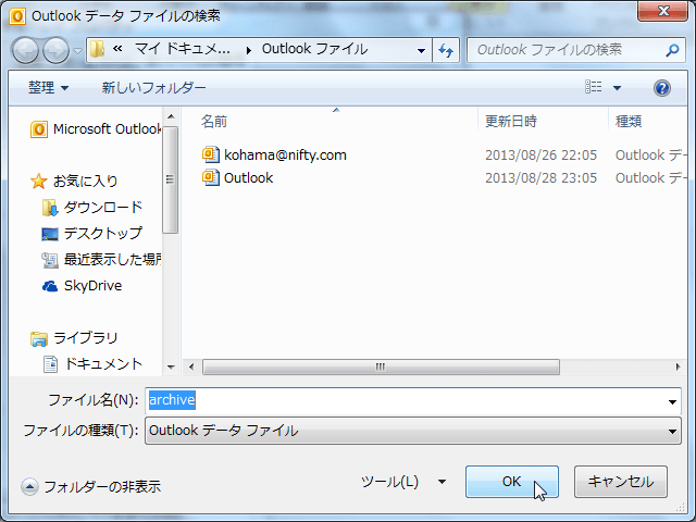 - [Outlookデータファイルの検索]からarchive.pst を生成する場所を選択して[OK]ボタンをクリックします。