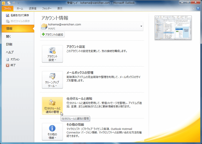 - [ファイル]タブを開き、対象となるアカウントを選択して[仕分けルールと通知]ボタンをクリック