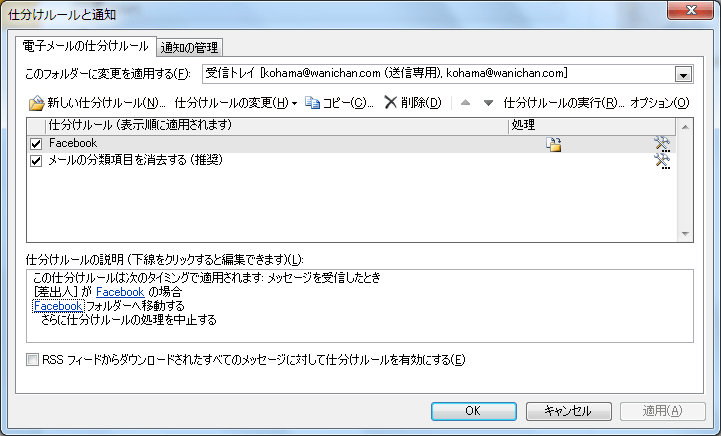 従来の[仕分けルールと通知]ダイアログボックスを使って操作するには