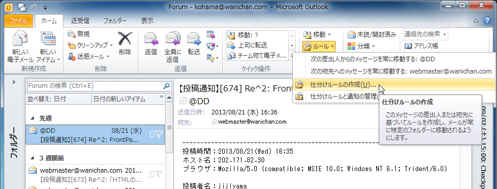 - [ホーム]タブの[移動]グループの[ルール]をクリックして、[仕分けルールの作成]をクリックします。