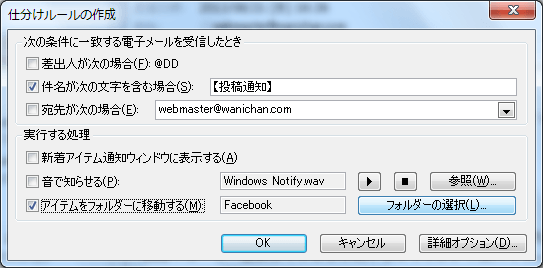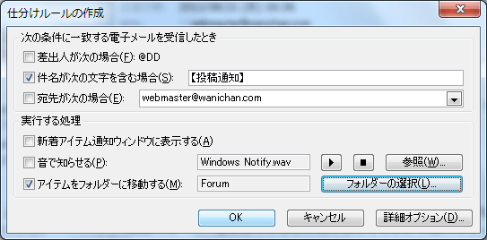 - [アイテムをフォルダーに移動する]にチェックを入れて、[フォルダーの選択]ボタンをクリックします。