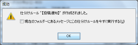 - [現在のフォルダーにあるメッセージにこの仕分けルールを今すぐ実行する]にチェックを入れて[OK]ボタンをクリックすると、該当するメッセージがすべて指定フォルダーに移動されます。