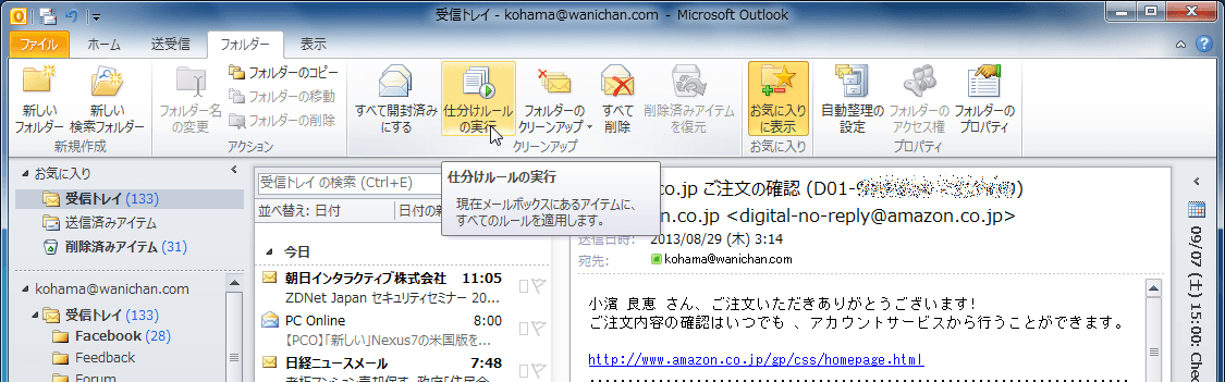 - [フォルダー]タブを開き、[クリーンアップ]グループの[仕分けルールの実行]をクリックします。