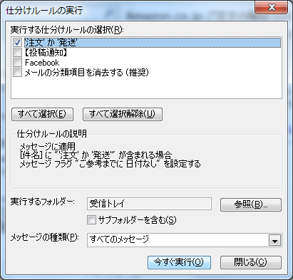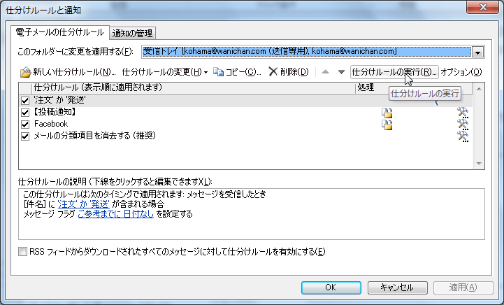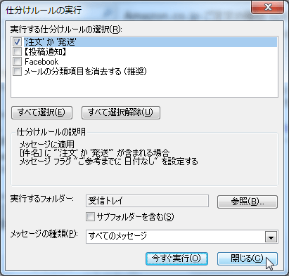 - [仕分けルールの通知と管理]ダイアログボックスで[仕分けルールの実行]をクリックします。