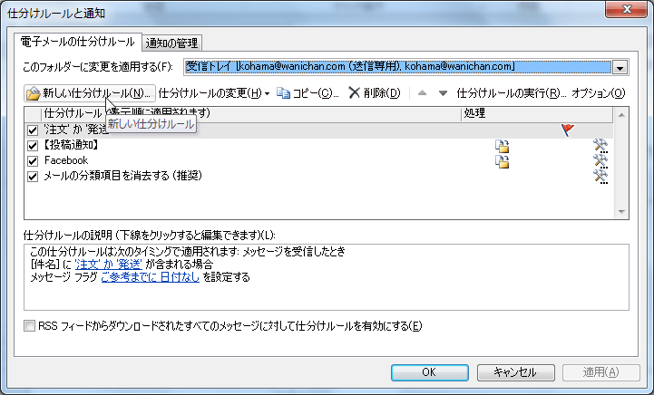 - [仕分けルールの通知と管理]ダイアログボックスの[新しい仕分けルール]をクリックします。