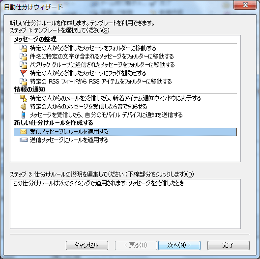 - [新しい仕分けルールを作成する]グループの[受信メッセージにルールを適用する]を選択して[次へ]ボタンをクリックします。