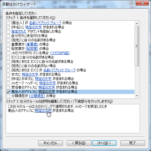 - 「差出人のアドレスに特定の文字が含まれる場合」にチェックを入れて、ステップ2の下線をクリックします。
