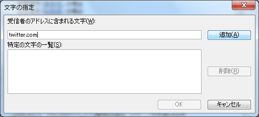 - [文字の指定]ダイアログボックスの[差出人のアドレスに含まれる文字]ボックスに「twitter.com」と入力して[追加]ボタンをクリックします。