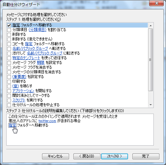 - ステップ1の[指定フォルダーに移動する]にチェックを入れて、ステップ2の下線部分をクリックします。