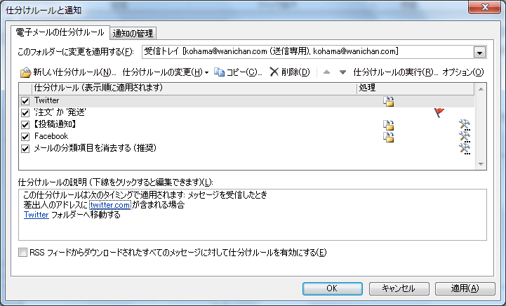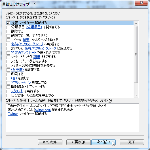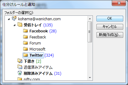 ここでは、Twitterの通知メールをまとめてTwitterフォルダーに移動してみましょう。Twitterの通知メールアドレスは必ず twitter.com が含まれています。そこで、差出人のアドレスに「twitter.com」が含まれる場合に「Twitter」フォルダーに移動する方法について説明します。