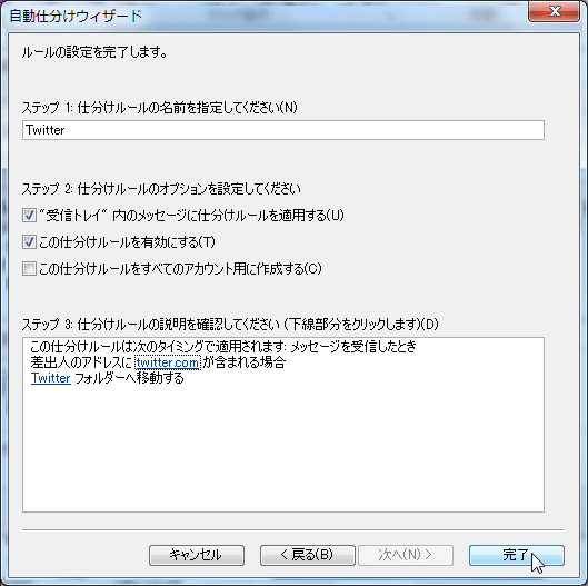 - 仕分けルールの名前を指定します。その場で仕分けルールを実行したい場合は下の図のように["受信トレイ"内のメッセージに仕分けルールを適用する]にチェックを付けて[完了]ボタンをクリックします。