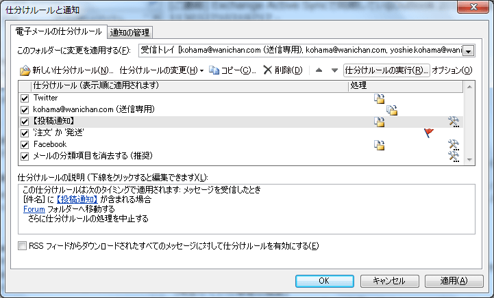 のアイコンがついています。そのルールを上に持っていくとOKです。この設定は、ほかの仕分けルールの条件とダブっても「さらに仕分けルールの処理を中止する」ルールが最優先されるため、そのあとのルールに基づいた別の処理がされたり、ダブってほかのフォルダーにコピーされたりすることはありません。