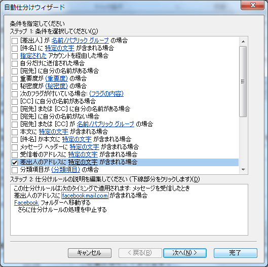 - 自動仕分けウィザードが表示されたら、ルールを編集して、[完了]ボタンをクリックします。