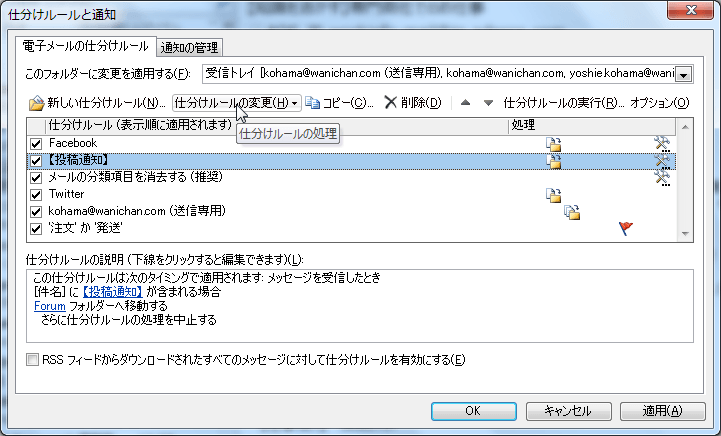 - [仕分けルールの通知と管理]ダイアログボックスで、名前を変更したいルールを選択し、[仕分けルールの変更]をクリックします。