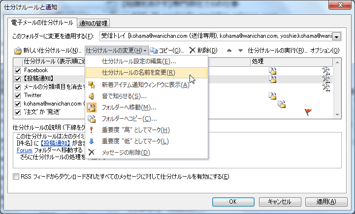 作成済みの仕分けルールを後で変更するには、[仕分けルールと通知]ダイアログボックスを開いて操作します。仕分けルールの名前を変更することも可能です。