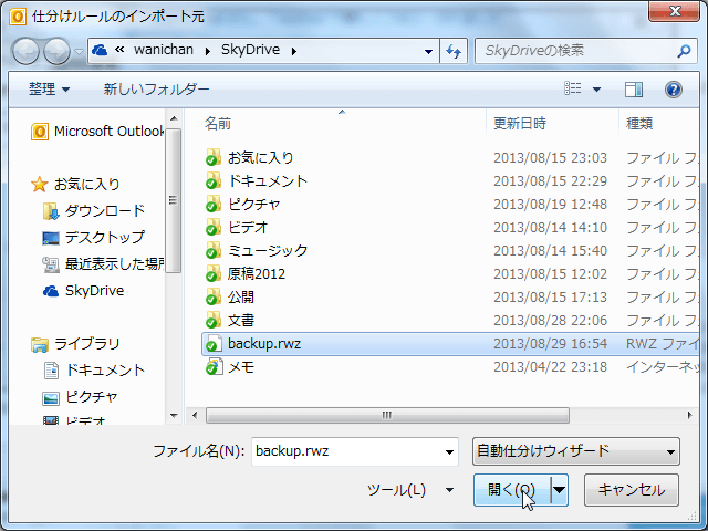 仕分けルールを複数のPCにも適用させたい場合、そのルールを保存して、他のPCにその保存した仕分けルールの設定ファイルを使って適用することができます。仕分けルールの保存ファイルの拡張子は「.rwz」です。