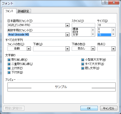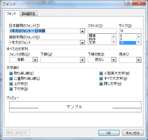 - [フォント]ダイアログボックスで、フォントやフォントサイズを調整して[OK]ボタンをクリックします。