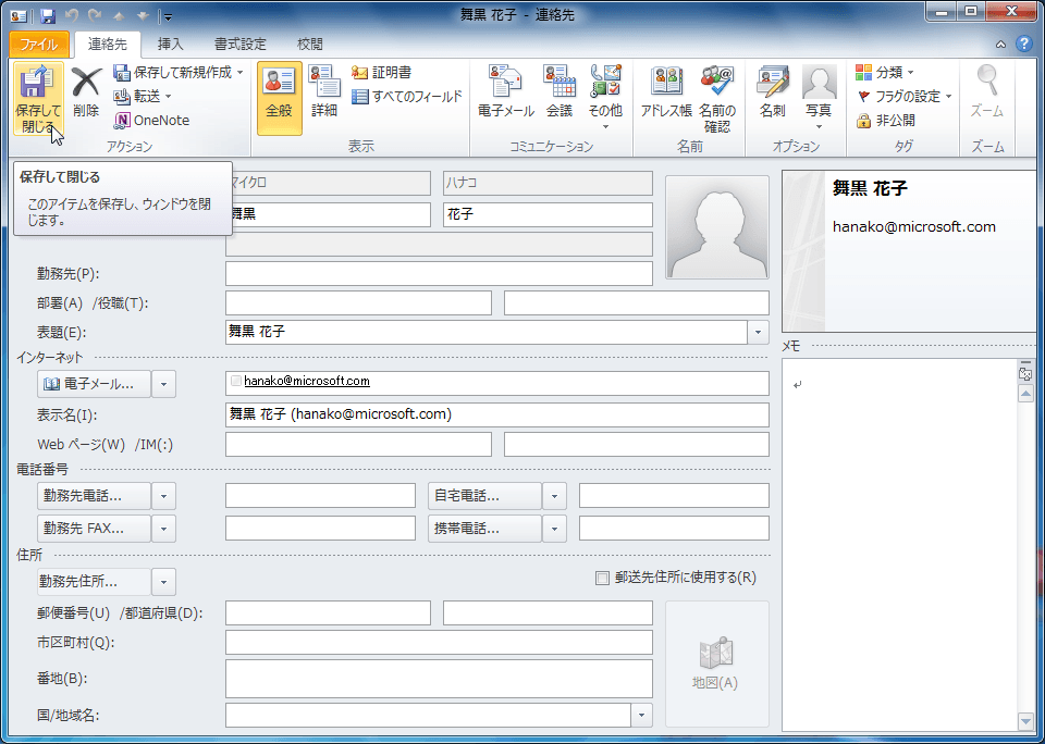 [連絡先]タブの[保存して閉じる]をクリックすると、保存してそのウィンドウを閉じることができます。