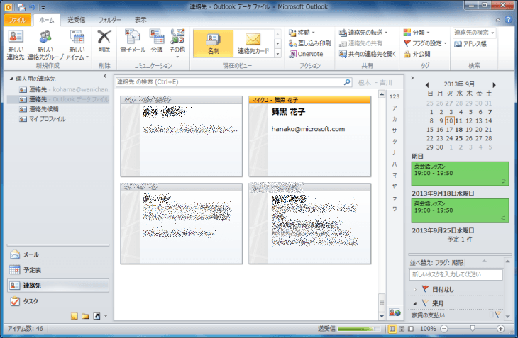 Outlook 2010で連絡先ビューの[新しい連絡先]をクリックして、氏名、電子メールアドレスなどを入力し保存します。[連絡先]タブの[保存して閉じる]をクリックすると、保存してそのウィンドウを閉じることができます。