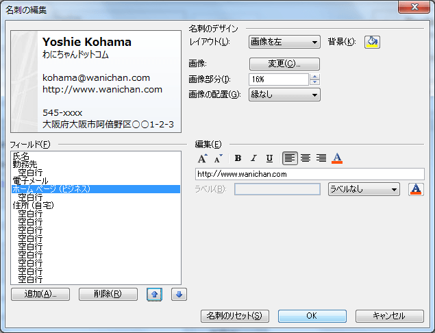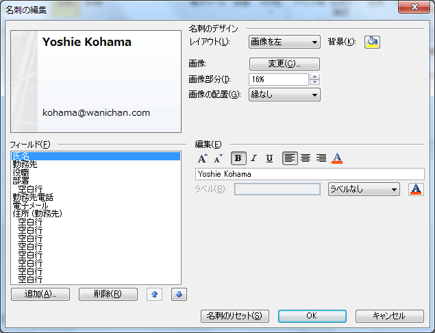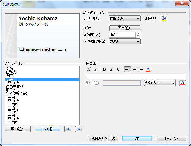 - 名刺の各項目(フィールド)を編集するには、そのフィールドを選択して、データを編集します。不要なフィールドの場合は、下の図のようにフィールドを選択して[削除]ボタンをクリックします。
