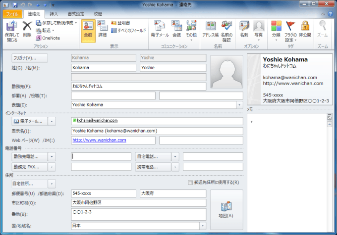 - 任意の連絡先(たとえば自分の連絡先)をダブルクリックして開きます。