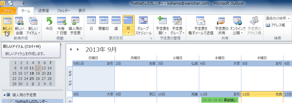 - [ホーム]タブの[新規作成]グループの[新しい予定]をクリックします。