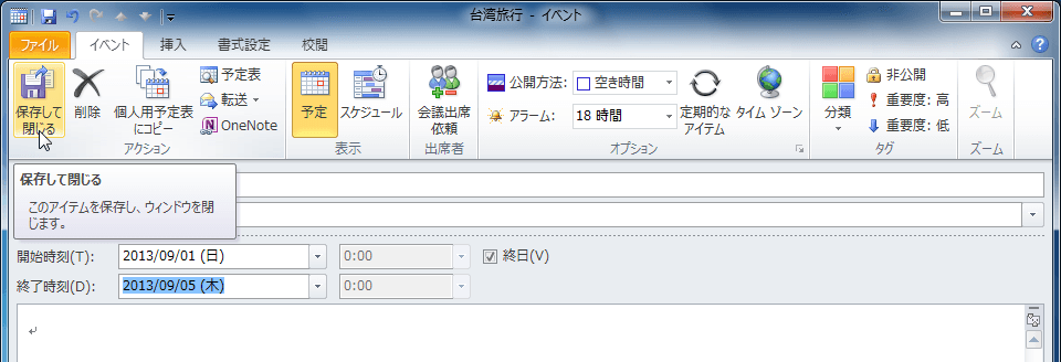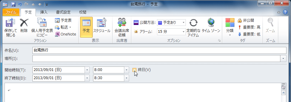Outlook 2010で旅行などで複数の日にまたがるイベントを作成するには、終日のチェックを付けて、開始時刻と終了時刻の日付にそれぞれ開始日と終了日を指定します。