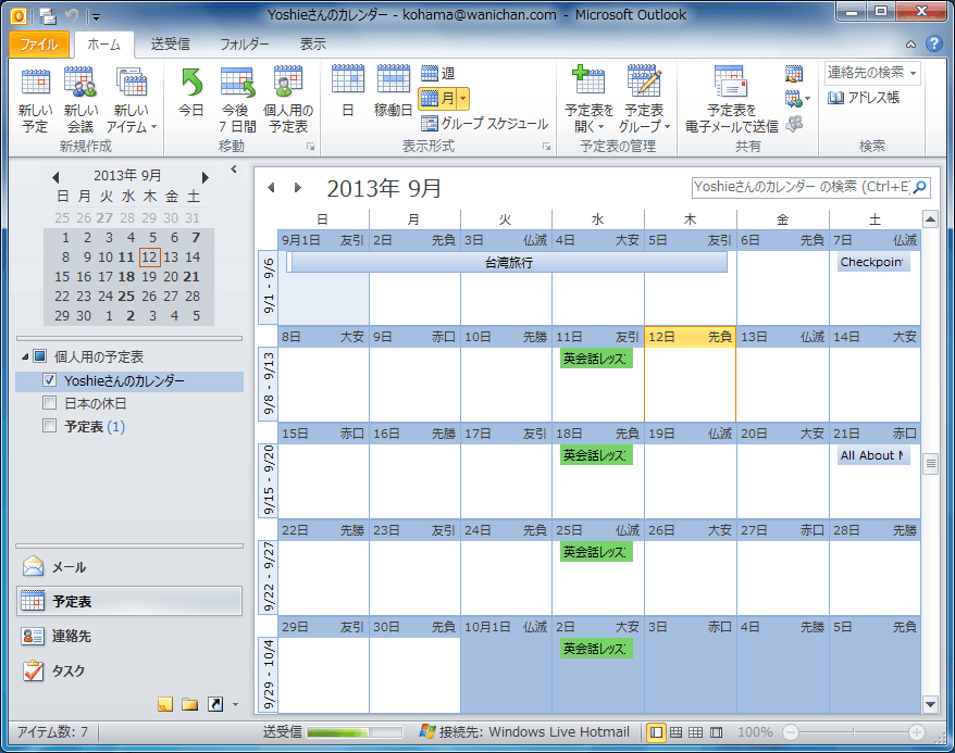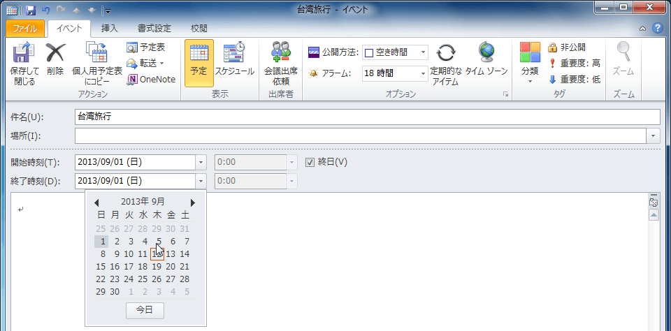 たとえば、9月1日から5日まで台湾旅行の予定がある場合、終日のチェックを付けて、開始時刻ボックスの日付に9月1日、終了時刻の日付に9月5日を指定します。