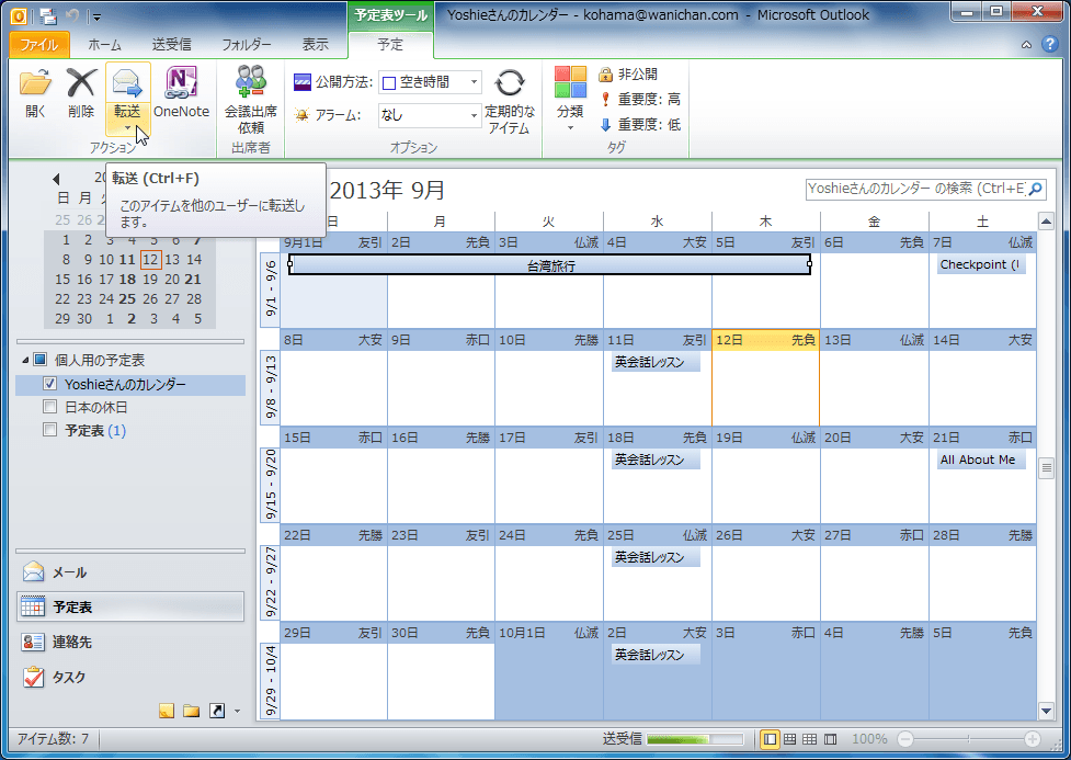 Outlook 2010で転送したい予定アイテムを選択し、[予定]タブの[アクション]グループの[転送]をクリックして、転送先を指定します。転送方法は、iCalまたはOutlook予定表アイテムのいずれか選択できます。