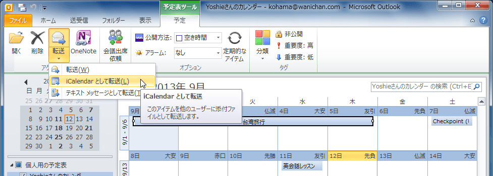 - サブメニューから[iCalendarとして転送]をクリックします。