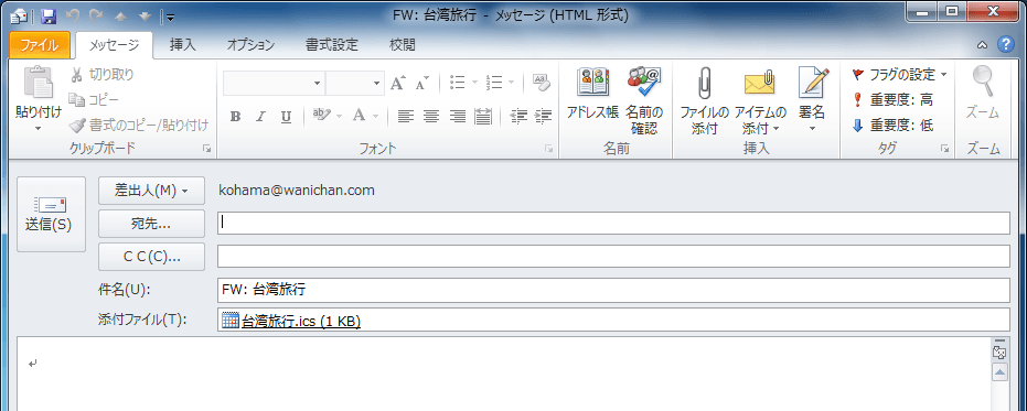 - 選択した予定アイテムが添付された新しいメッセージが表示されるので、宛先、件名、そして本文を指定または入力して[送信]ボタンをクリックします。