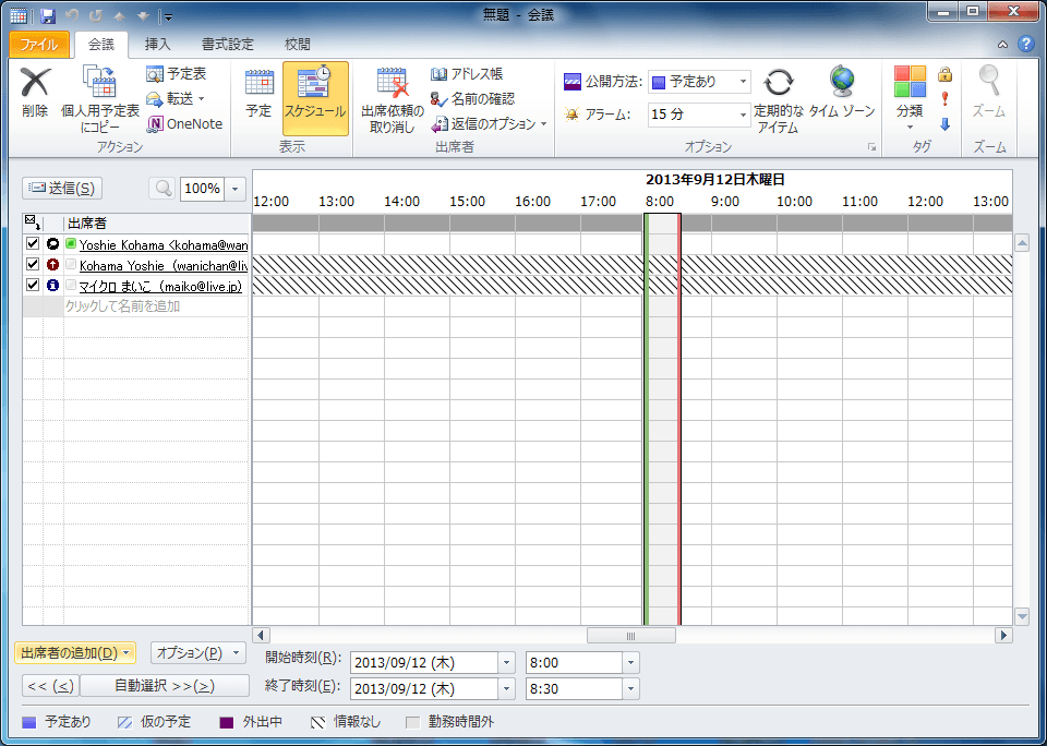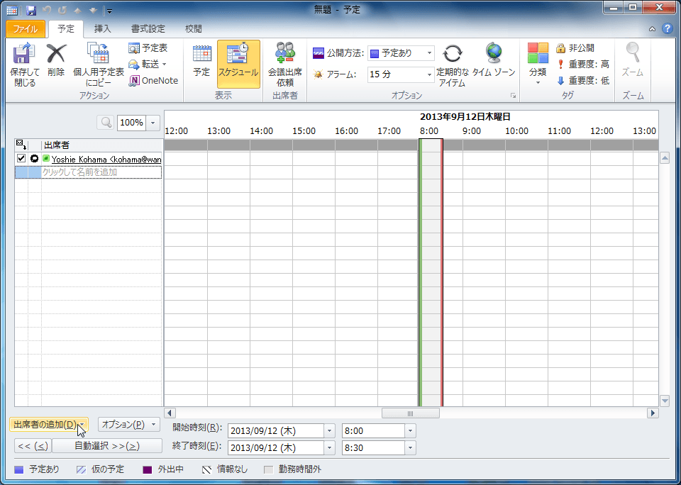 Outlook 2010で任意の予定を開くか新規作成をして[予定]タブの[表示]グループの[スケジュール]をクリックし、[出席者の追加]ボタンをクリックして会議の出席者を追加します。ここでは、出席者をアドレス帳から追加する方法について説明します。
