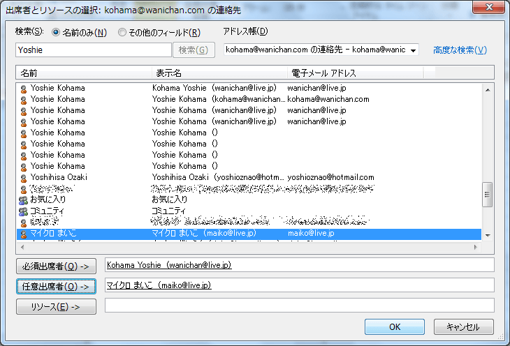 - [出席者とリソースの選択]ダイアログボックスが表示されたら、必須出席者や任意出席者などを指定していきます。必須出席者に追加するには、その人の名前を選択して[必須出席者]ボタンをクリックします。