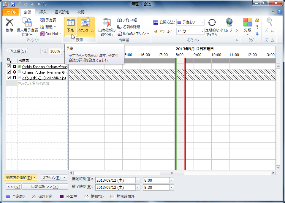 - [会議]タブの[表示]グループの[予定]をクリックすると、会議の詳細を設定できます。