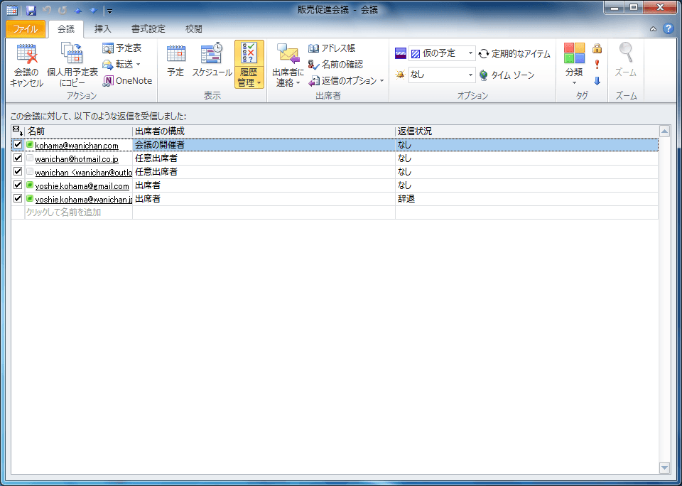 - この会議出席依頼にたいするすべての返信の現在の状態が表示されました。