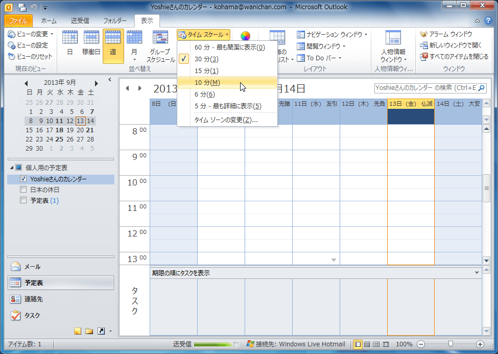 既定のタイムスケールは30分です。タイムスケールを変更することによって、細かな時間設定が思い通りに行えるようになります。タイムスケールの単位は60分、30分、15分、10分、6分、そして5分が最小単位です。Outlook 2010で[表示]タブをクリックし、[タイムスケール]をクリックして、一覧から変更したいタイムスケールを選択します。