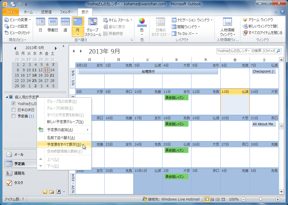 - フォルダーウィンドウの[個人用の予定表]を右クリックして、ショートカットメニューより[予定表をすべて表示]を選択します。