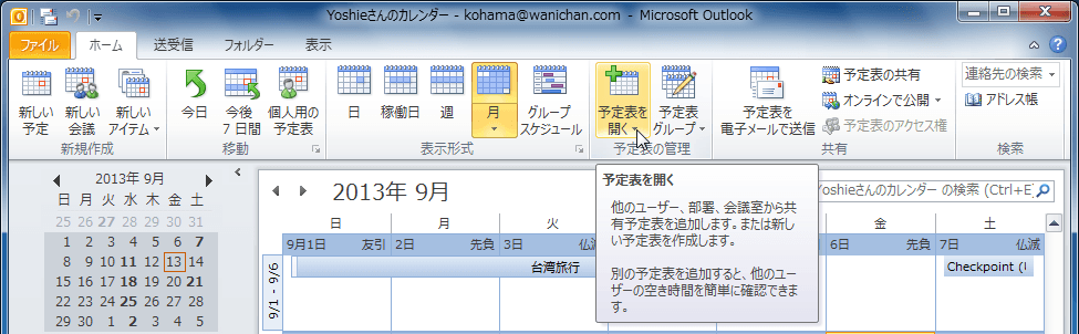 - [ホーム]タブを開き、[予定表の管理]グループから[予定表を開く]をクリックします。