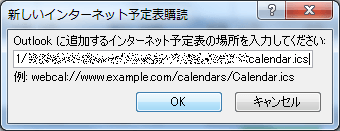 - [新しいインターネット予定表購読]ダイアログボックスに webcal://から始まるアドレスを入力して[OK]ボタンをクリックします。