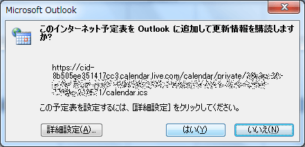 - 「このインターネット予定表をOutlookに追加して更新情報を購読しますか?」というメッセージが表示されたら[はい]ボタンをクリックします。