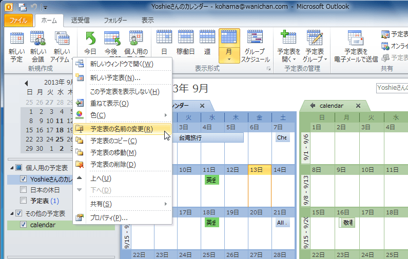 [calender]を右クリックして、ショートカットメニューより[予定表の名前の変更]を選択