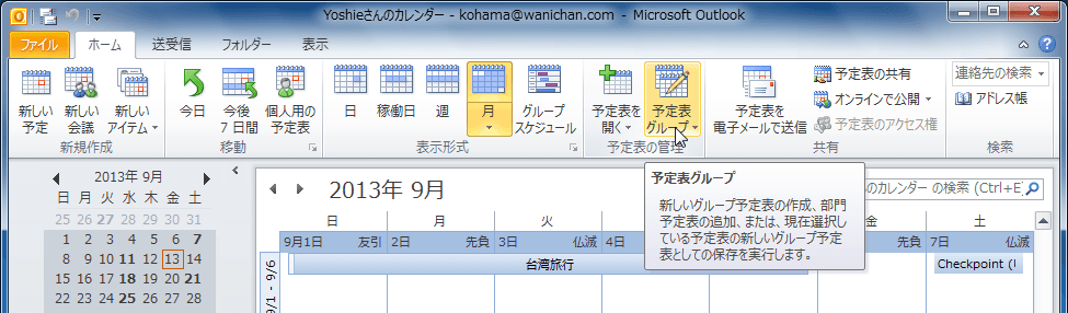 - [ホーム]タブを開き、[予定表の管理]グループの[予定表グループ]をクリックします。