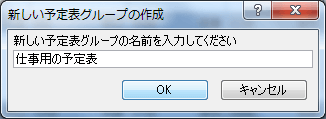 - [新しい予定表グループの作成]ダイアログボックスで、新しい予定表グループの名前を入力して[OK]ボタンをクリックします。